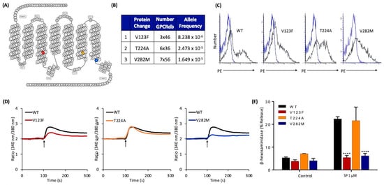 Next, we searched the GPCRdb [24] to determine if there were any missense MRGPRX2 variants present in the human population with mutations at or near position 3x46, 6x36, or 7x53. We identified three MRGPRX2 variants, namely V123F (3x46), T224A (6x36), and V282M (7x56) (Figure 3A,B). Allele frequency for each variant is shown in Figure 3B. We used the site-directed mutagenesis approach to generate cDNAs encoding each of these variants, which were then transiently transfected in RBL-2H3 cells. Flow cytometry analysis demonstrated that MRGPRX2 and all its variants were expressed on the cell surface (Figure 3C). SP-induced Ca2+ mobilization was partially reduced in cells expressing the variant V123F when compared to the WT receptor, but degranulation was completely inhibited (Figure 3D,E). However, cells expressing the variant T224A responded normally to SP for Ca2+ mobilization and degranulation (Figure 3B,D,E). By contrast, V282M variant was resistant to both SP-induced Ca2+ mobilization and degranulation (Figure 3B,D,E).