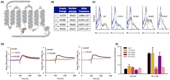 2.4. Naturally Occurring Missense MRGPRX2 Variants at the Second Intracellular Loop, R138C and R141C, Display Loss of Function Phenotype for SP-Induced MC Activation