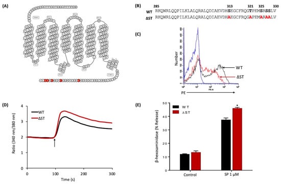 Phosphorylation of GPCRs by GPCR kinases provides an important mechanism for their desensitization [28,29,31]. Human MRGPRX2 possesses five potential phosphorylation sites at its carboxyl-terminus. To determine the role of MRGPRX2 phosphorylation on SP-induced responses, we generated cDNAs encoding an MRGPRX2 mutant in which all Ser/Thr residues were replaced with alanine (△ST-MRGPRX2) (Figure 5A,B). Transiently transfected RBL-2H3 cells demonstrated reduced cell surface expression of △ST-MRGPRX2, when compared to the WT receptor (Figure 5C). Despite this, SP induced greater Ca2+ mobilization and degranulation in cells expressing △ST-MRGPRX2 when compared to the WT receptor (Figure 5D,E).