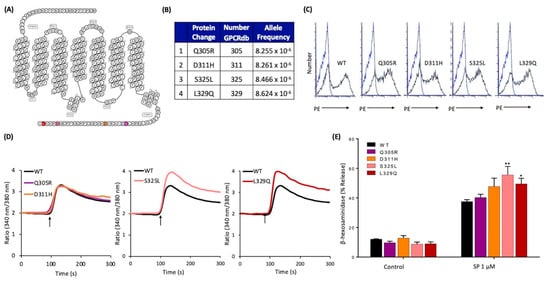 Effects of naturally occurring MRGPRX2 variants within the receptor’s carboxyl-terminus (Q305R, D311H, S325L, and L329Q) on SP-induced responses in transiently transfected RBL-2H3 cells. (A) Snake diagram of secondary structure of MRGPRX2. Each circle represents amino acid residue with one letter code. Solid purple, orange, pink, and red backgrounds denote the naturally occurring missense variants Q305R, D311H, S325L, and L329Q, respectively; (B) amino acid change for each MRGPRX2 variant with allele frequency; (C) cell surface expression of WT-MRGPRX2 and its variants was determined by flow cytometry using PE-anti MRGPRX2 antibody. Representative histograms for WT/variant (black line) and control untransfected cells (blue line) are shown; (D) cells expressing WT-MRGPRX2 and its variants were loaded with Fura-2 and intracellular Ca2+ mobilization in response to SP (1 μM) was determined. Data shown are representative of three independent experiments; (E) cells were exposed to buffer (control) or SP (1 μM) for 30 min, and β-hexosaminidase release was determined. All data points are the mean ± SEM of at least three experiments performed in triplicate. Statistical significance was determined by a nonparametric t-test. * p ≤ 0.05 and ** p ≤ 0.01.