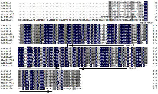 Alignment of AnEXPA1 and AnEXPA2 amino acid sequences with GmEXPA4 (NP_001240136), GhEXPA10 (XP_016674217), MtrEXPA10 (XP_003613849), AtEXPA15 (NP_178409), and AtEXPA24 (NP_198747). The signal peptide site is marked with a black line segment. The starting and ending sites of Domain I and II are marked with a single-headed arrow. The histidine, phenylalanine, and aspartate residue (HFD) sites are marked with a rectangular frame. Dark blue, similarity up 100%; dark gray, similarity up 75%; light gray, similarity up 50%.