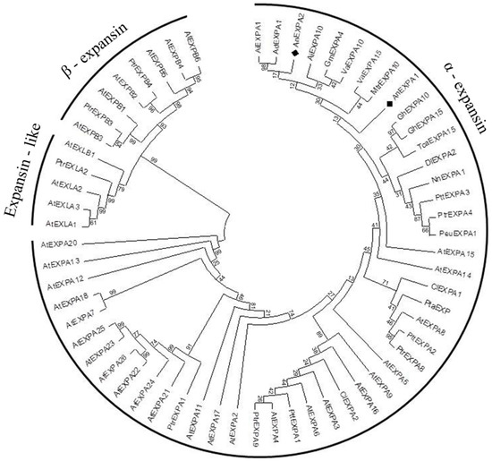 Phylogenetic analysis of AnEXPA1 and AnEXPA2 proteins. Evolutionary relationships were inferred using the neighbor-joining method. The bootstrap consensus tree inferred from 1000 replicates was used to represent the evolutionary history of the taxa analyzed. The Expansin proteins used in the phylogenetic tree analysis were from the plants Ammopiptanthus nanus AnEXPA1 (KC184696), AnEXPA2 (KC184697), Gossypium hirsutum GhEXPA10 (XP_016674217), GhEXPA15 (XP_016705834), Arachis ipaensis AiEXPA1 (XP_016190918), AiEXPA10 (XP_016202753), Arachis duranensis AdEXPA1 (XP_015956912), Medicago truncatula MtrEXPA10 (XP_003613849), Populus euphratica PeuEXPA1 (XP_011013147), Theobroma cacao TcaEXPA15 (XP_017971673), Dimocarpus longan DlEXPA2 (ACA05165), Arabidopsis thaliana AtEXPA2 (NP_196148), AtEXPA3 (NP_181300), AtEXPA4 (NP_181500), AtEXPA5 (NP_189545), AtEXPA6 (NP_180461), AtEXPA7 (NP_172717), AtEXPA8 (NP_181593), AtEXPA9 (NP_195846), AtEXPA11 (NP_173446), AtEXPA12 (NP_001327548), AtEXPA13 (NP_566197), AtEXPA14 (NP_001332570), AtEXPA15 (NP_178409), AtEXPA16 (NP_191109), AtEXPA17 (NP_192072), AtEXPA18 (NP_176486), AtEXPA20 (NP_195534), AtEXPA21 (NP_198742), AtEXPA22 (NP_198743), AtEXPA23 (NP_198744), AtEXPA24 (NP_198747), AtEXPA25 (NP_198746), AtEXPA26 (NP_198745), AtEXPB1 (NP_001324426), AtEXPB2 (NP_564860), AtEXPB3 (NP_567803), AtEXPB4 (NP_182036), AtEXPB5 (NP_001319806), AtEXPB6 (NP_001117554), AtEXLA1 (NP_190183), AtEXLA2 (NP_195553), AtEXLA3 (NP_001030815), AtEXLB1 (NP_193436), Pinus taeda PtaEXP (AF085330_1), Populus tremula × Populus tremuloides PttEXPA1 (AAR09168), PttEXPA2 (AAR09169), PttEXPA3 (AAR09170), Populus trichocarpa PtEXPB3 (XP_006371575), PtEXLA2 (XP_002313682), PtrEXPA1 (XP_002323897), PtrEXPA4 (XP_002315043), PtrEXPA8 (XP_002325925), PtrEXPA9 (XP_002315218), PtrEXPB4 (XP_002320708), Cunninghamia lanceolata ClEXPA1 (ABL09849), ClEXPA2 (ABM54492), Glycine max GmEXPA4 (NP_001240136), Vigna angularis VaEXPA10 (XP_017427959), VaEXPA15 (XP_017421014), and Nelumbo nucifera NnEXPA1 (XP_010258310). The two AnEXPA locations are marked with a black diamond.
