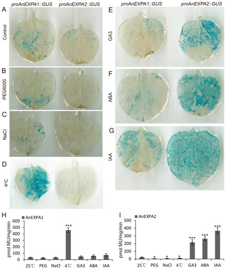 To further verify the reliability of the qRT-PCR results during different abiotic stress and hormone treatments, tobacco leaves with proAnEXPA1::GUS and proAnEXPA2::GUS were used to analyze β-glucuronidase (GUS) activity. Under normal conditions, both the promoters of AnEXPA1 and AnEXPA2 activated the transcription of the GUS reporter gene, but the production of GUS was low (Figure 5A). However, the promoter of AnEXPA1 did not improve GUS production under 40% PEG6000 and 0.25 M NaCl treatment (Figure 5B,C), but they increased GUS production under 4 °C stress (Figure 5D). These results suggested that AnEXPA1 significantly responds to cold stress but not to drought and salt stress. In tobacco leaves with proAnEXPA2::GUS, drought, salt, and cold stresses did not induce, but instead reduced GUS production (Figure 5B–D). Moreover, the GUS activity assay showed the same results (Figure 5H,I). This indicated that AnEXPA2 may not be involved in the response to abiotic stress.