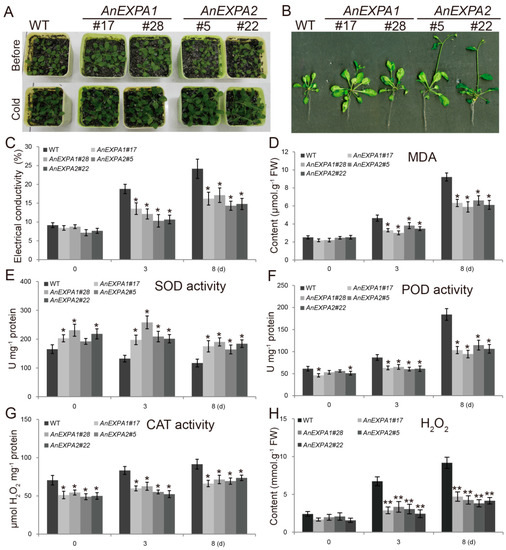 Analysis of cold tolerance in the AnEXPA1 and AnEXPA2 transgenic Arabidopsis plants. (A,B) Five-week-old transgenic seedlings were compared with non-transgenic plants before and after treatment at 6 °C for 8 d. (C–H) Comparison of electrical conductivity, malondialdehyde (MDA) content, activities of superoxide dismutase (SOD), peroxidase (POD), and catalase (CAT), and H2O2 content in the WT and transgenic plants at 6 °C for 8 days. Every transgenic line was measured at least three times. Different symbols above the columns indicate significant differences (* p < 0.05, ** p < 0.01). WT, non-transgenic Arabidopsis plants. #17 and #28, AnEXPA1 transgenic lines. #5 and #22, AnEXPA2 transgenic lines.