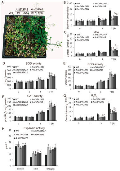 Analysis of drought tolerance in the AnEXPA1 and AnEXPA2 transgenic Arabidopsis plants. (A) Five-week-old transgenic plants under controlled water at normal temperature for 7 days. (B–G) Comparison of electrical conductivity, MDA content, the activities of SOD, POD, and CAT, and H2O2 content in the WT and transgenic Arabidopsis plants during controlled water treatment. (H) Expansin activity was analyzed by measuring the production of 4-methylumbelliferone (MU) under cold and drought stresses. Every transgenic line was measured at least three times. Different letters above the columns indicate significant differences (* p < 0.05, ** p < 0.01). WT, non-transgenic Arabidopsis plants. #17 and #28, AnEXPA1 transgenic lines. #5 and #22, AnEXPA2 transgenic lines.