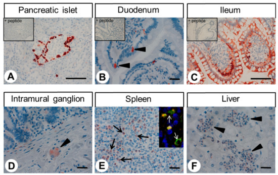 Immunohistochemical detection of GPR68 localisation in different normal human tissues (I). Immunohistochemical staining (red-brown colour), counterstaining with haematoxylin. Scale bar: 100 µm (A,C) and 30 µm (B,D–F). Insets in (A–C): For adsorption controls, the anti-GPR68 antibody 16H23L16 was incubated with 10 µg/mL of the peptide used for immunisations. Arrowheads in (B): positive neuroendocrine cells; arrowhead in (D): positive intramural ganglion in the duodenum; arrows in (E): positive immune cells in the spleen; arrowheads in (F): positive immune cells in the liver, from the shape of their nuclei probably representing granulocytes. Inset in (E): double-labelling immunohistochemical analysis of human spleen tissue. Samples were incubated with the rabbit monoclonal anti-GPR68 antibody 16H23L16 together with a mouse monoclonal anti-CD68 antibody. Labelling for GPR68 was visualised using a Cy3-conjugated anti-rabbit antibody (red), and immunostaining for CD68 was envisioned using an Alexa Fluor 488-conjugated anti-mouse antibody (green). White arrows indicate the double-labelled cells.