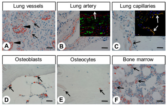 Immunohistochemical detection of GPR68 localisation in different normal human tissues (II). Immunohistochemical staining (red-brown colour), counterstaining with haematoxylin. Scale bar: 30 µm (A–F). Arrowheads in (A): positive muscle layers of arterioles, arrows in (A): positive capillaries; arrow in (C): positive capillary; arrows in (D) positive osteoblasts; arrows in (E): positive osteocytes; arrows in (F): positive mononuclear cells. Insets in (B,C): double-labelling immunohistochemical analysis of human lung tissue. Samples were incubated with the rabbit monoclonal anti-GPR68 antibody 16H23L16 together with either a mouse monoclonal anti-smooth muscle actin antibody (B) or a mouse monoclonal anti-CD31 antibody (C). Labelling for GPR68 was visualised using a Cy3-conjugated anti-rabbit antibody (red), and immunostaining for alpha smooth muscle actin or CD31 was envisioned using an Alexa Fluor 488-conjugated anti-mouse antibody (green). White arrow in (B) indicates the lumen of the artery; white arrows in (C) indicate double-labelled capillaries.