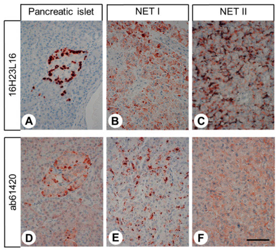 Comparative immunohistochemical stainings with the novel monoclonal rabbit anti-GPR68 antibody 16H23L16 or with the polyclonal rabbit anti-OGR1 antibody ab61420 (Abcam). Immunohistochemical staining (red-brown colour), counterstaining with haematoxylin. Scale bar: 100 µm (A–F). NET: neuroendocrine tumour.