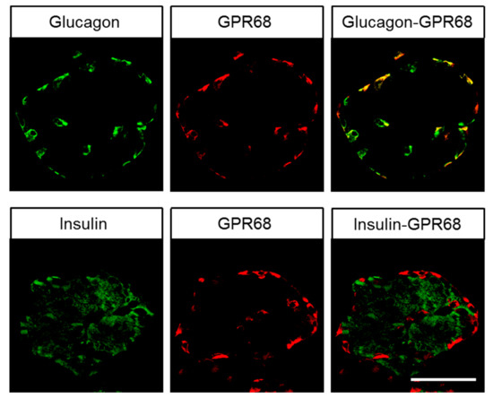 Double-labelling immunohistochemical analysis of human pancreatic islets. Sections were dewaxed and microwaved in citric acid. Adjacent sections of each tissue sample were incubated with the rabbit monoclonal anti-GPR68 antibody 16H23L16 together with mouse monoclonal antibodies against insulin or glucagon. Labelling for GPR68 was visualised using a Cy3-conjugated anti-rabbit antibody (red), and labelling for insulin and glucagon was envisioned using an Alexa Fluor 488-conjugated anti-mouse antibody (green). Scale bar: 100 µm.