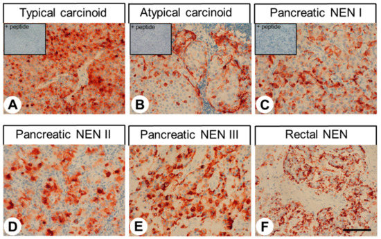 GPR68 expression pattern in different bronchopulmonary and gastroenteropancreatic neuroendocrine tumour entities. Immunohistochemical staining (red-brown colour), counterstaining with haematoxylin. Scale bar: 100 µm (A–F). Insets in (A–C): for adsorption controls, the anti-GPR68 antibody 16H23L16 was incubated with 10 µg/mL of the peptide used for immunisations. NEN: neuroendocrine neoplasm.