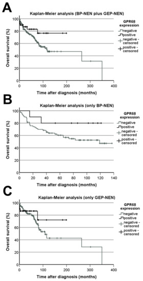 GPR68 expression-related overall survival of patients. Kaplan–Meier analysis of patient survival with respect to GPR68-positive and -negative tumours. (A) Bronchopulmonary tumours (BP-NEN) plus gastroenteropancreatic neuroendocrine tumours (GEP-NEN). (B) Only BP-NEN. (C) Only GEP-NEN. Log-rank test: p = 0.104 (A), p = 0.140 (B), and p = 0.465 (C).