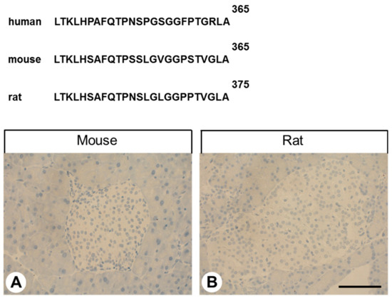 Carboxy-terminal sequence of human, mouse and rat GPR68 and negative GPR68-immunostaining in mouse and rat pancreatic islets. Immunohistochemical staining (red-brown colour), counterstaining with haematoxylin. Scale bar: 100 µm (A,B).