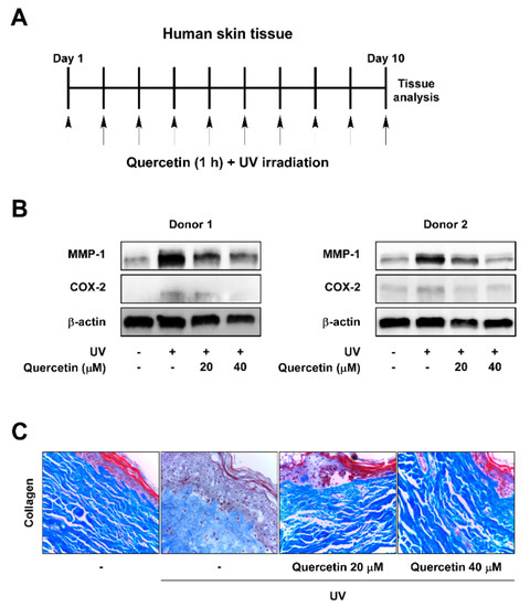 Skin tissue (diameter of 10 mm) was incubated with DMEM (Corning, New York, NY, USA) containing 10% fetal bovine serum (Gibco, Waltham, MA, USA) with penicillin/streptomycin (Corning, New York, NY, USA) at 37 °C in a humidified incubator containing 5% CO2. Ex vivo human skin tissues were treated with quercetin and exposed to UV daily for 10 consecutive days.