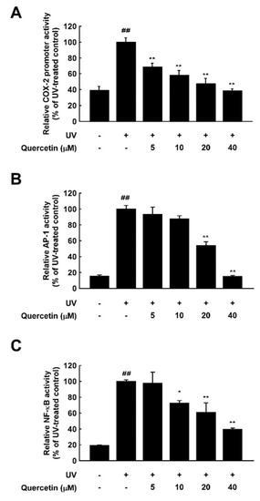 Inhibitory effect of quercetin against UV-induced COX-2 promoter activity and AP-1 and NF-κB activation. Cells stably expressing COX-2 promoter reporter or AP-1 or NF-κB reporter plasmids were used. Quercetin was treated at the indicated concentrations for 1 h prior to UV irradiation. Luciferase activity was measured for (A) COX-2, (B) AP-1, and (C) NF-κB. ## indicate significant (p < 0.001) induction by UV compared to the un-treated control. *,** indicate significant (p < 0.05, and p < 0.001, respectively) inhibition of activity by quercetin compared to the UV-only group.