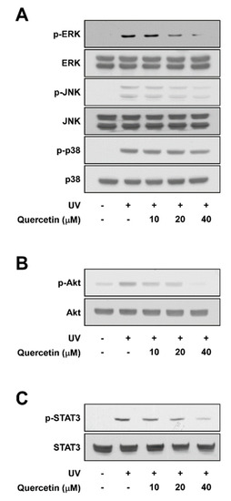 Effect of quercetin on UV-induced signaling pathways. Cells were pre-treated with quercetin at the indicated concentrations for 1 h, before exposure to UV irradiation. Protein levels of phosphorylated and total (A) ERK, JNK, p38; (B) Akt; and (C) STAT3 were assessed in cell lysates by immonoblot. Immunoblots are representative images of three independent experiments.