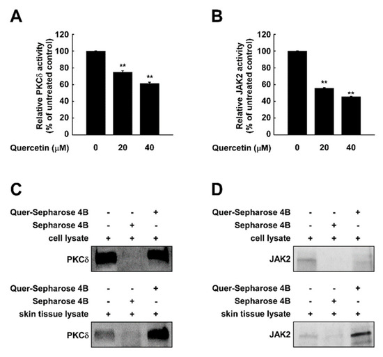As suppressing PKCδ displayed similar signaling patterns to that of quercetin treatment, we questioned whether quercetin affects PKCδ activity. To examine the effect of quercetin on PKCδ kinase activity, we examined the in vitro kinase activity using purified PKCδ. Quercetin inhibited PKCδ activity in a dose-dependent manner (Figure 5A). In addition, as STAT3 is a direct substrate of JAK2, we also examined if quercetin targets JAK2. Treatment with quercetin reduced the activity of JAK2 kinase (Figure 5B). A pull-down assay using quercetin-conjugated sepharose 4B beads showed that quercetin directly interacts with PKCδ isolated from both skin cells and tissue extracts (Figure 5C). Also, quercetin-sepharose 4B beads, but not sepharose 4B beads alone, bound JAK2 from skin cells and human skin tissue extracts (Figure 5D). These results indicate that quercetin can bind to JAK2 and PKCδ in the skin and inhibit their kinase activities.