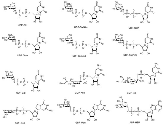 Common sugar nucleotides found in all kingdoms of life. Abbreviations: UDP-Glc, UDP-glucose; UDP-GalNAc, UDP-N-acetyl-2-deoxy-d-galactosamine; UDP-GalA, UDP-d-galacturonic acid; UDP-GlcA, UDP-d-glucuronic acid; UDP-GlcNAc, UDP-N-acetyl-2-deoxy-d-glucosamine; UDP-FucNAc, UDP-N-acetyl-l-fucosamine; UDP-Gal, UDP-d-galactose; CMP-Kdo, CMP-3-deoxy-d-manno-octulosonate; CMP-Sia, CMP-N-acetylneuraminic acid; GDP-Fuc, GDP-l-fucose; GDP-Man, GDP-d-mannose; ADP-HEP, ADP-l-glycero-d-manno-heptose.