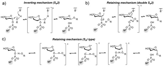 Reaction mechanism of glycosyltransferases upon inversion (a) or retention (b,c) of the anomeric glycosidic bond. The divalent metal (M2+) is not necessarily a requirement for catalytic activity for GTs.