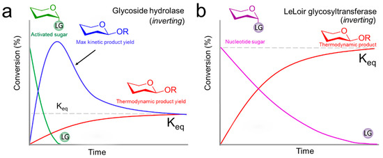 One of the notable discoveries on glycosyltransferases was the recognition that glycosyltransferases do not catalyze unidirectional reactions [144]. Alternatively, synthetic sugar donors and/or (chemo) enzymatic regeneration systems either alter the overall Keq or regenerate the nucleotide in situ [145,146,147,148,149]. Such regeneration systems are not always a requirement; the glycosylation with nucleotide sugar donors allows for repeated glycosylation on a single aglycon (i.e., flavonol-O-diglycoside [150]) or elongation of a (poly)saccharide, such as glycogen with a molecular weight of up to 107 kDa [151]. The high glycosylation efficiency with Leloir GTs arises from a favorable thermodynamic equilibrium Keq in these examples, determined by the sugar nucleotide donor and carbohydrate or aglycone acceptor, pH, and ionic strength. As mentioned earlier, in a few examples the hydrolysis of the NDP-sugar donor has been reported for Leloir GTs [70,71,72,73,74,75,76,77]. In these particular cases, it is important to emphasize that the glycosylation with Leloir GTs is under kinetic control, and the sugar acceptor and water are competing nucleophiles throughout the entire course of reaction [70,71,72,73,74,75,76,77].