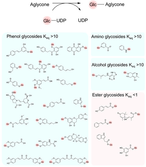 Glycosylation of aglycones producing phenolic glycosides, amino glycosides, alcohol glycosides, ester glycosides, and disaccharides with their estimated Keq. The Keq was calculated from the Gibbs free energy ΔGr′° using the eQuilibrator web interface (http://equilibrator.weizmann.ac.il) [155] assuming the following conditions: ionic strength 0.1 M, pH 7.0, aglycon (1 mM), UDP (1 mM), UDP-d-glucose (1 mM), glycosylated product (1 mM), and 298 K.