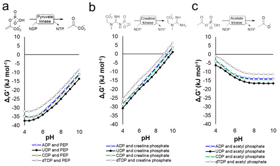 The use of different energy-rich phosphate donors to regenerate NTP using either pyruvate- (a), creatine- (b), or acetate kinase (c). The ΔrG′° represents the standard change of Gibbs free energy and was calculated using the eQuilibrator web interface (http://equilibrator.weizmann.ac.il) [155] using the following conditions: ionic strength 0.1 M, pH 7.0, 1 mM of component, 298 K. Abbreviations: NDP, nucleotide diphosphate; NTP, nucleotide triphosphate; ADP, adenosine diphosphate; UDP, uridine diphosphate; CDP, cytidine diphosphate; dTDP; deoxythymidine diphosphate; PEP, phosphoenolpyruvate.