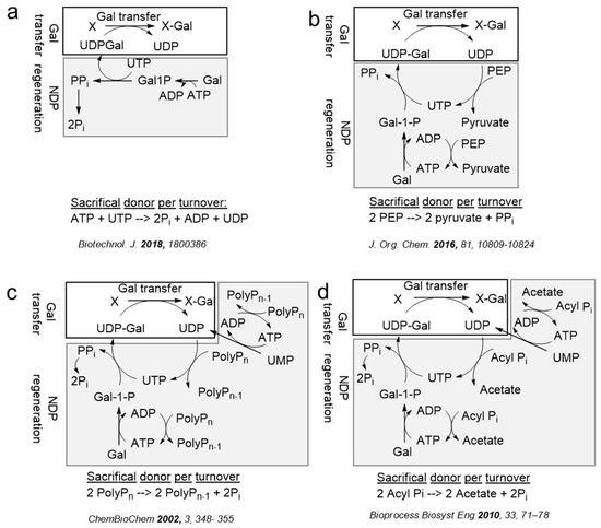 Several sacrificial phosphate donors for sugar nucleotide (re)generation systems of galactosyltransferases using a stoichiometric amount of NTPs (a) [199], PEP (b) [200], PolyPn (c) [189], and acyl Pi (d) [201]. Abbreviations: PPi, pyrophosphate; Pi, orthophosphate; UMP, uridine monophosphate; UDP, uridine diphosphate; UTP, uridine triphosphate; UDP-Gal, UDP-d-galactose; ADP, adenosine diphosphate; ATP, adenosine triphosphate; Gal, d-galactose; Gal1P, d-galactose-1-phosphate; PEP, (phospho)enol pyruvate; PolyPn, (poly)phosphate; acyl Pi, acetyl phosphate.