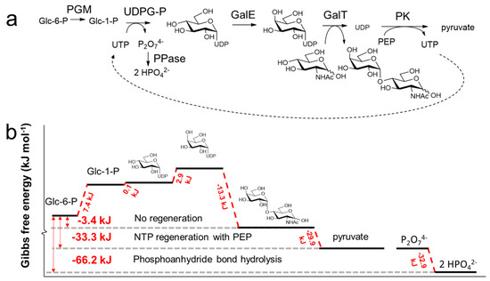 Often, one-pot multienzyme (OPME) cascade reactions do not go to completion without the thermodynamic driving force from in-situ regeneration systems of nucleotide sugar donors. For instance, the gram-scale OPME cascade of the glycoconjugate N-acetyl-d-lactosamine resulted in 85% isolated yields and TTN of 80 for UTP (Figure 10a) [208]. The PEP/UDP-regeneration system produces UTP at the expense of PEP while the hydrolysis of pyrophosphate provides the thermodynamic driving force to complete the glycosylation cycle (Figure 10b). Upon replacement of the PEP/UDP-regeneration system with (poly)phosphate/UDP for the enzymatic production of N-acetyl-d-lactosamine, no additional pyrophosphatases are required [195]. Here, the required driving force is generated by the hydrolysis of the energy rich phosphoanhydride bond in (poly) phosphate instead of pyrophosphate hydrolysis.