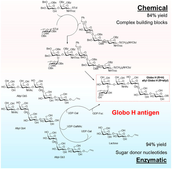 - Su, D.M.; Eguchi, H.; Yi, W.; Li, L.; Wang, P.G.; Xia, C. Enzymatic synthesis of tumor-associated carbohydrate antigen Globo-H hexasaccharide. Org. Lett. 2008, 10, 1009–1012. [Google Scholar] [CrossRef]