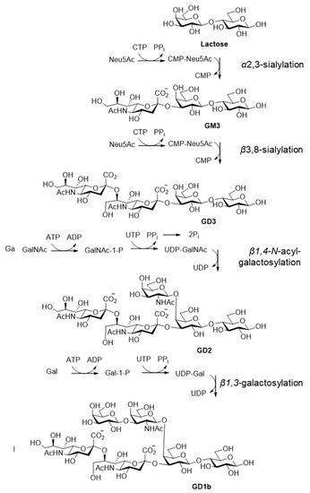 Sequential OPME synthesis allows for the coupling of glycosidic linkages which are synthetically challenging, such as sialylation. The production of disialoganglioside cancer antigens GD1b and its derivatives by two sequential α-sialylation reactions has been performed using an engineered Leloir glycosyltransferase [200] with limited nucleotide donor hydrolysis activity (Figure 12) [223]. Lactose was converted to the trisaccharide GM3 using α2-3 sialyltransferase 1 (M144D) from Pasteuralla multocida, followed by a second α3,8-sialylation in 85% yield to GD3 fusing α2-3/8-sialyltransferase from Campylobacter jejuni. Subsequently, the quantitative enzymatic β1-4-GalNAc coupling to GD2 with β1-4-GalNAc transferase from Campylobacter jejuni followed by β1-3-Gal transfer with β1-3-galactosyltransferase resulted in GD1b with an overall isolated yield of 73% [223].