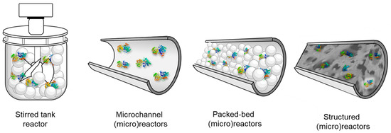Different examples of reactors that have been used with glycosyltransferases are shown in Figure 15. Stirred tank reactors are flexible in design and operation conditions, but often require high operation costs and vary in the product quality per batch [128,259,266,270,271]. Microchannel reactors feature flow-through channels of micrometric sizes that contain the enzyme immobilized on their wall surface [277]. Packed-bed (micro) reactors contain fine particles with immobilized enzymes in a flow-through channel, allowing for a higher volumetric activity than microchannel reactors. The heterogenous biocatalyst should not be able to compact to avoid high pressure drops, while mass transport between liquid reactants and catalyst surface is enhanced owing to a more chaotic flow which facilitates mixing. The large pressure drop, even at low flow rates may, however, be a problem if fine catalyst particles are applied. Structured microreactors contain a reactor core made of a porous monolithic structure with open, usually curved pores/channels connected with each other offering excellent mixing and mechanical stability. Moreover, the pressure drop can be significantly reduced and flow rate increased, compared to the packed-bed reactors, and this boosts productivity. The enzymes are immobilized either on the external surface of the monolith or in its pores [273].