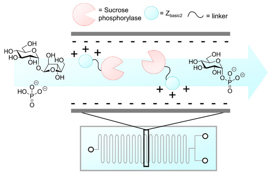 Glass microchannel reactor with immobilized enzyme sucrose phosphorylase attached to the siliceous wall [277]. Attachment occurs via the highly positively charged Zbasic2 binding module, which binds to the negatively charged silica surface.