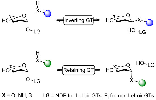 For Leloir glycosyltransferases, the binding of the sugar donor nucleotide and acceptor follows a sequential ordered bi-bi catalytic mechanism via non-covalent interactions of the sugar donor nucleotide. The binding of the sugar or aglycone acceptor results in an enzyme-substrate ternary complex [41]. Hydrolysis of the sugar nucleotide donor is prevented by the tight binding in an unproductive state, where the high affinity of the enzyme for the sugar nucleotide donor is an indicator for product inhibition (Ki) by the released nucleotide [42]. For Leloir glycosyltransferases, a lower affinity or promiscuity towards the nucleotide donor results often in less product inhibition [43]. Upon binding of the sugar nucleotide donor, the enzyme undergoes a conformational change stabilizing the transition state, resulting in the formation of a glycosidic bond and the release of the nucleotide donor. Different reaction mechanisms of glycosyltransferases have been described and reviewed [26,27,44,45,46,47]. The inverting occurs via a SN2 mechanism, while a retaining transfer can proceed via a concerted or ion-pair intermediate mechanism through a double displacement via a SN2 mechanism. Also, a transient covalent intermediate via a SNi-type mechanism has been described for LeLoir GTs (Figure 4). Inverting glycosyltransferases use general base catalysis (i.e., aspartate or glutamate) [31,48,49] to form an oxocarbenium ion-like transition state. They show a catalytic rate enhancement by utilizing divalent metals (i.e. Mn (II) or Mg (II)), which are often coordinated by the amino acid motif Asp-X-Asp.