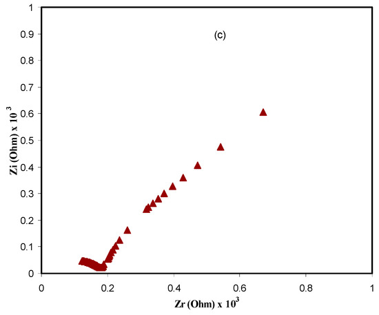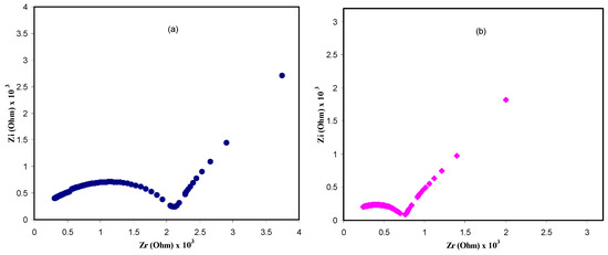 In Figure 3, the impedance plots (Zi versus Zr) for the CS: POZ: Mg(CF3SO3)2 system is shown at different temperatures. It is clearly seen that there is a semicircle in the high frequency region and a linear line (i.e., spike) in the low frequency region. The physical meaning of the semicircle is that this bulk effect reflects a parallel combination of bulk resistance (Rb) and bulk capacitance of the polymer electrolytes. For the spike explanation, there is an effect of electrode blocking [34,35]. From the data analysis, Rb values were extracted from the intercept of high frequency semicircles with the real axis of the impedance plots. Moreover, there is the fact that the complex impedance is dominated by the ionic conductivity when the phase angle approaches zero [36]. Furthermore, the direct current (DC) conductivity (σdc) values were calculated from the following relation: