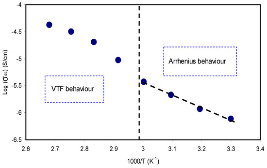 where ni is the charge carrier′s concentration (i.e., number of charge), q is the electron charge, and µi is the ions mobility (where i refers to the identity of the ion) [20]. It is clear from Equation (2) that the ionic conductivity (σ) increases as the charge carrier concentration (n) and/or the ionic species mobility increase in the system. Indeed, the ionic mobility is determined by the three main factors, electronegativity, size of ions, and interaction between polymers and ions. In comparison, the mobility of smaller ions (Li+ and/or Mg2+) is higher than that of larger ions (Na+ and/or Zn2+) in the polymer electrolyte [37]. The careful choice of SPEs in a certain application of an electrochemical device depends on the σdc value. Figure 4 shows the direct current(DC) conductivity as a function of 1000/T for the CS: POZ: MgTf solid polymer blend electrolyte film. Herein, the relationship between DC conductivity and temperature is explained in the form of the Arrhenius equation for linear parts (T≤ 60 °C) as given below: