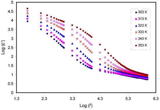 Frequency dependence of dielectric constant (ε′) at selected temperatures for the CS: POZ: MgTf system. Noticeably, the dielectric constant rises with temperature rise.