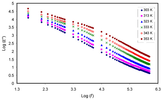 Figure 5 and Figure 6 show the dielectric constant (ɛ′) and dielectric loss (ɛ′′) as a function of frequency, respectively. As the frequency increases, both ɛ′ and ɛ′′ decrease gradually to a minimum value, becoming almost constant at high frequencies. The obtained high values of both parameters in the low frequency region can be attributed to electrode polarization effect [20,58,59]. This effect is found to result from charge accumulation at the electrode/electrolyte interfacial region [60]. The constant values of both the dielectric constant and dielectric loss at high frequencies can result from the periodic reversal of the high electric field. Consequently, there is no charge accumulation at the interface. The absence of a more interesting observation for the dielectric relaxation peaks within the dielectric loss plot can be due to the mask of polymer relaxation segments by the DC ionic conductivity of charge carriers [22,23,24]. Studying temperature clearly showed that with increasing temperatures, the dielectric constant also increases. This can be clearly observed in Figure 5, which also supports our interpretations given in Section 3.1 for causes of increasing DC conductivity. Once the dielectric constant is obtained, it will be easy for researchers to identify the two following important phenomena: reduction of silver ions to metallic silver particles and electrical percolation in ion conducting solid polymer composites [21,58,61,62,63]. One can note from Figure 5 and Figure 6 that both ε′ and ε′′ values recorded high values at high temperature. This can be explained in terms of the forces that bind the polymer chains together. Obviously, there is an existence of forces within polymer material matrices, which are generally classified into primary (intra-chain) and secondary (inter-chain) forces, that result in the stabilization of polymer structure [23,64]. On the one hand, the primary ones arise from the covalent bond formation (2.2–8.6 eV), which binds the chains of backbone atoms together. On the other hand, there are four types of secondary forces in polymers, which are dipole–dipole bonding (0.43–0.87 eV), hydrogen bonding (0.13–0.30 eV), induced interaction (0.07–0.13 eV), and dispersion interaction (0.002–0.09 eV). These forces possess relatively low dissociation energies; thereby, these forces are extremely susceptible to temperature change compared to their primary counterpart.