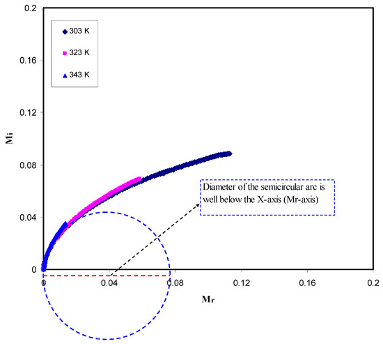 The electric modulus is the inverse of electric permittivity and can be used to study the dielectric behavior of a polymer resulting from ion relaxation. In this work, suppression of charge accumulation near the electrode is related to the electrode polarization effects [52,65]. Figure 7 and Figure 8 exhibit the real (Mr) and imaginary (Mi) components of electric modulus versus frequency, respectively. In contrast to the ɛʹ spectra in Figure 5, detectable peaks, especially for curves at 303K and 313K resulting from conductivity relaxation, are seen in the Mi spectra as presented in Figure 8. It is observable that both Mr and Mi decrease towards low frequencies, indicating the negligibility of electrode polarization influence. In both plots, the curves show long tail features at low frequency at various temperatures that can be due to the suppression of low frequency electrodes/sample double layer effects, arising from the large capacitance establishment [66,67]. In contrast to the ɛ′ spectra in Figure 5, detectable peaks, which result from conductivity relaxation, can be seen in the Mi spectra as shown in Figure 8. Previously, it had been confirmed that ɛ′ parameter is always influenced by an ohmic conduction, i.e., DC conductivity, which leads to the hidden loss peaks in the ɛ′ spectra [68]. A peak in the Mi spectra indicates the regions where the carrier can move a long distance (left of the peak) or where the carrier is confined (right of the peak) [69]. Viscoelastic relaxation or conductivity relaxation using Argand plots is the well-known method to explain the relaxation dynamic. Studying Argand plots at various temperatures is informative to address the nature of relaxation processes within the present polymer electrolytes.