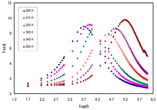 In polymer electrolyte systems with high electrical conductivity, the peaks at the low frequency relaxation can be masked due to permanent or induced dipoles by polarization relaxation of mobile charged species in the material [73]. To understand the relaxation process, the dielectric loss tangent (tanδ) as a function of frequency has been plotted as shown in Figure 10. The plot shape of tanδ can be interpreted in terms of Koop′s phenomenological principle [74]. Thereby, tanδ increases with increasing frequency, reaching a maximum value, and thereafter decreases with further increasing frequency. On the one hand, at lower frequencies, where tanδ increases, theohmic component of the current increases more sharply than its capacitive component (Xc = 1/2πfC). On the other hand, at higher frequencies, where tanδ decreases, the ohmic component of current is obviously frequency independent and the capacitive component increases due to the high value of f and as a consequence, the value of Xc is small [74,75]. It is worth-noticing that the broad nature of the tanδ peaks suggests that the relaxation process is of non-Debye type [76]. The complex impedance relationship is Z* = R-jXc, where R is the real or resistor element and Xc is the capacitive element [62]. This function indicates that, at low frequency, the capacitive component becomes very high and as a result, most of the current passes through the resistor element. The tanδ relation (tanδ = ɛ′′/ɛ′) shows the proportionality of tanδ to ɛ′′. Also, from these relationships, one can obtain ɛ′′, which is exactly in proportion to the real part (Z′ or R) of the impedance function, through the following equation: