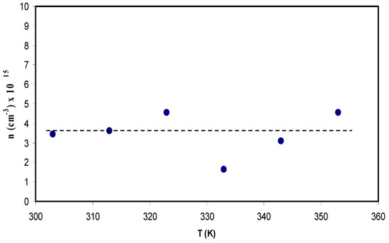 Figure 12 shows charge density (n) as a function of temperature. It is seen that the n does not change as temperature increases. The Trukhan model allows an estimation of the diffusion coefficient (D), mobile ion concentration (n), and mobility (μ) from the value of (tanδmax), where δ is a phase angle. The model is simple in analysis of the data points and there is no need for microscopic information about the distance between adjacent functional groups. However, any increase and decrease of tanδmax intensity directly affects the behavior of carrier density. Chandra et al. [79] have recorded that the value of n is found to be in the range of 1016 to 1018 cm−3 for PEO: PVP: AgNO3 based SPE systems. Agrawal et al. [80] have studied the mobile ion concentration in the range of 1015 to 1016 cm−3 for hot press PEO: AgNO3: SiO2 nano-composite system. It is also documented that the conductivity is dependent on both the number of mobile ions and mobility [80]. In the present work, values of the carrier density of (1.5–4.7) × 1015 cm−3 were recorded and are in good agreement compared to those reported for polymer based solid electrolytes in the literature [79,80].