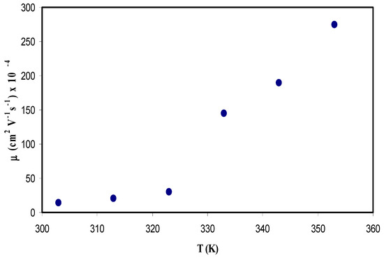 Figure 13 shows the relation between temperature and ion mobility. The dependence of μ on temperature is similar to that in diffusivity. An increase in temperature results in an increase in the mobility, however, this increase does not linearly change. The concept of increasing the ion mobility is supported by the free volume model, in which the temperature increase leads to enlarged free volume in the amorphous phase, which helps ion mobility [75]. For example, the ion mobility values have been found to be 1.5 × 10−3 cm2/Vs at room temperature, while it is about 2.8 × 10−2 cm2/Vs at 353 K. Winie et al. [81] have also confirmed such a direct proportionality relationship between ion mobility and temperature. Several research groups have reported results on ion mobility. Majid and Arof [82] recorded the value of mobility (μ) in the range 10−8 to 10−6 cm2 V−1 s−1. Agrawal et al. [80] reported a different value of 10−3 cm2 V−1 s−1 for ionic mobility. Moreover, Arya and Sharma [83] reported ion mobility (μ) in the range 10−10 to 10−12 cm2 V−1 s−1. More recently, Patla et al. [84] have also documented ion mobility (μ) in the range 1.8 × 10−4 to 9.5 × 10−11 cm2 V−1 s−1 for polyvinylidene fluoride (PVDF) based polymer nano-composites incorporated with ammonium iodide (NH4I) salt. From the results of the present work, it is clear that ion transport parameters can be easily estimated from the Trukhan model. It has been reported that polymers with optical absorption behaviour and high-performance optical properties are important in the application of solar cell devices [85,86,87]. Similarly, fabrication of polymer electrolytes with high ionic conductivity and improved ion transport properties are crucial in the application of electrochemical devices [14,16].