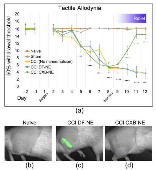 First demonstrated by Bennett and Xie [2] chronic constriction injury (CCI) of a peripheral nerve is known to induce hypersensitivity, which is interpreted as neuropathic pain caused by the neuroinflammation. Here we report that after baseline behavioral testing, CCI or sham surgery was performed on day 1, followed by behavioral testing daily on days 2 through 12 post-surgery. The effects of celecoxib-loaded nanoemulsion (CXB-NE) treatment on CCI rats was determined by using the paw withdrawal threshold when probed with von Frey filaments of increasing diameter [33,34]. All CCI animals experienced mechanical allodynia one-week post-injury, with a maximum in pain-like behavior plateauing on day 8 (Figure 1a), at which time celecoxib-loaded nanoemulsion (CXB-NE) or drug-free nanoemulsion (DF-NE) is administered by tail vein injection [35]. Data are expressed as the mean ± SD (n = 5 per group). Significance was determined by two-way ANOVA followed by Tukey’s post-hoc test (GraphPad Prism, version 7.3, San Diego, CA, USA). No statistically significant difference is evident in the comparison of sham control to the non-surgical naïve animal. Furthermore, no statistically significant difference was observed between CCI DF-NE animals compared to CCI animals receiving no nanoemulsion at all. A statistically significant difference in allodynia is evident between sham and naïve controls compared to CCI starting on day 5 post-surgery. One day after the nanoemulsion celecoxib drug therapy, treated animals exhibit a statistically significant reduction in hypersensitivity ultimately to return to a withdrawal latency equivalent to sham/naïve within three days of the tail vein injection. On day 12, the drug treated CCI animals exhibit a statistically significant relief in pain-like behavior as compared to both the CCI DF-NE (vehicle) and the CCI only (no nanoemulsion) animals (0.624, p value < 0.0001).
