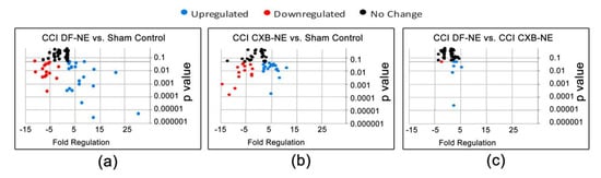 Gene list representing volcano plots in Figure 2. Expression changes are represented as fold regulation. Positive values indicate an increased expression, whereas negative values indicate decreased expression. (a) Genes differentially expressed in CCI DF-NE versus sham, (b) genes differentially expressed in CCI CXB-NE versus sham, (c) genes differentially expressed in CCI DF-NE versus CCI CXB-NE.