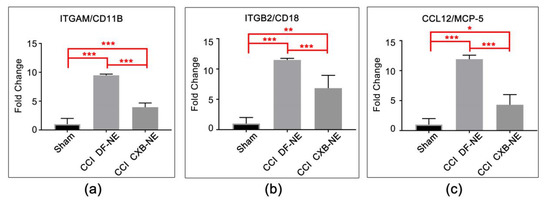 mRNA expression of macrophage-related genes at the site of injury. (a) Itgam/Cd11b mRNA is significantly elevated in the CCI pain-state (DF-NE) over sham, and is significantly reduced in the CXB-NE drug treated CCI condition. (b) Itgb2/Cd18 (integrin β-2) mRNA is significantly elevated in the CCI pain state (DF-NE) over sham, and is significantly reduced in the CXB-NE drug treated CCI condition. (c) Mcp-5 mRNA is significantly elevated in the CCI pain-state (DF-NE) over sham and is significantly reduced in the CXB-NE drug treated CCI condition. One-way ANOVA with Tukey post-hoc analysis is considered statistically significant if p value < 0.05. Sham = 6, CCI CXB-NE n = 8, CCI DF-NE n = 6. * p value ≤ 0.05; ** p value ≤ 0.001; *** p value ≤ 0.0001.