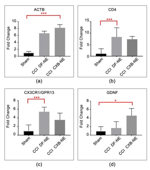 mRNAs responsive to CCI. (a) Actin beta (Actb) mRNA expression is elevated in response to CCI treatment and is not responsive to CXB-NE drug therapy. (b) Cd4 is typically associated with T cells and is similarly responsive to CCI treatment but is not responsive to CXB-NE therapy. (c) Cx3cr1 (Chemokine CX-3-C motif, receptor 1) is expressed widely on the cell surface of neurons, macrophages, circulating monocytes, T cells, and Schwann cells. The mRNA expression is elevated in response to CCI treatment. (d) Gdnf (glial-derived neurotrophic factor) is produced by neurons and glial cells and appears to be responsive in the CCI condition to the CXB-NE drug therapy. One-way ANOVA with Tukey post-hoc analysis is considered statistically significant if p value < 0.05. Sham = 6, CCI CXB-NE n = 8, CCI DF-NE n = 6. * p value ≤ 0.05; *** p value ≤ 0.0001.