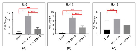 Cytokine mRNA expression at the site of injury. (a) cytokine IL-6 (interleukin-6) mRNA is significantly increased in response to CCI and is significantly attenuated with CXB-NE drug therapy. (b) IL-1β (interleukin-1 beta) mRNA is significantly increased in response to CCI, and is significantly attenuated with CXB-NE drug therapy. (c) IL-18 (interleukin-18) are produced and released by multiple cell types at the site of CCI injury is significantly increased in response to CCI, and is attenuated with CXB-NE drug therapy. One-way ANOVA with Tukey post-hoc analysis is considered statistically significant if p value < 0.05. sham = 6, CCI CXB-NE n = 8, CCI DF-NE n = 6. ** p value ≤ 0.001; *** p value ≤ 0.0001.