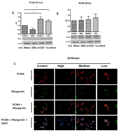 Effect of low, medium and high IL-6 concentrations on PCNA, MyoD and myogenin protein levels in C2C12 cells. (A) PCNA protein levels in C2C12 cells treated with low, medium and high IL-6 concentrations for 24 h. (B) MyoD protein levels in C2C12 cells treated with low, medium and high IL-6 concentrations for 24 h. (C) Immunofluorescence staining for PCNA and myogenin in C2C12 cells treated with low, medium and high IL6 concentrations for 24 h. The experiment was repeated three times. Immunofluorescence images were taken at 100× magnification. Results are presented as mean ± standard error of the mean (S.E.M). Statistical analysis: ANOVA and Bonferroni post hoc test. * p < 0.05.