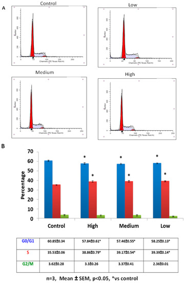 Effect of low, medium and high IL-6 concentration on C2C12 cell cycling after 48 h of treatment. (A) Flow cytometric analysis of IL-6-treated cells to determine the effect of low, medium and high IL-6 concentrations on C2C12 cell cycling was done after 48 h incubation (B) C2C12 cells (%) in each cell cycle stage after treatment of cells with low, medium and high IL-6 concentrations for 48 h. The experiment was repeated three times. Results are presented as mean ± standard error of the mean (S.E.M). Statistical analysis: ANOVA and Bonferroni post hoc test. * p < 0.05; relative to control.
