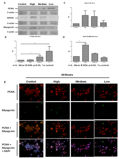 To evaluate IL-6-mediated changes in PHMs, cells were treated with low and high IL-6 concentrations for 24 and 48 h followed by determination of PCNA and myogenic regulatory factors (MRFs), MyoD and myogenin. Western blot analysis shows that at 24 h low IL-6 concentration caused significant increases in PCNA levels compared to controls (Figure 8A,C). At the same time point, low IL-6 had essentially no effect on MyoD expression compared to controls (Figure 8A,C). In contrast, treatment of PHMs with high IL-6 concentration resulted in increased MyoD levels compared to control cells at the 24 h time point (Figure 8A,C). Immunofluorescence analysis largely substantiated these findings (Figure 8E). After 24 h of incubation, low IL-6 concentration caused increased PCNA expression (Figure 8E). High IL-6 concentration-treated cells displayed MyoD and myogenin levels similar to controls, whilst PCNA was decreased.