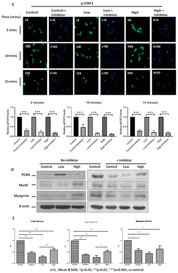 IL-6 activates the STAT3 signaling pathway in C2C12 cells. (A) Evaluation of p-STAT3 protein levels in C2C12 cells at 5 min up to 30 min after treatment of cells with low, medium and high IL-6 concentrations. (B) Quantification of western blot images shown in (A). (C) Effect of JAK-STAT inhibitor, AG490, on p-STAT3 expression in C2C12 cells over 15 min after treatment with low and high IL-6 concentration. (D) Effect of JAK-STAT inhibitor, AG490, on PCNA, MyoD and myogenin protein levels in C2C12 cells after treatment with low and high IL-6 concentrations (top panel) and densitometric quantification of images (lower panel) (E) Quantification of PCNA, MyoD and myogenin protein levels in C2C12 cells after treatment with low and high IL-6 concentrations plus JAK-STAT inhibitor, AG490. The experiment was repeated three times. Immunofluorescence images were taken at 100× magnification. Results are presented as mean ± standard error of the mean (S.E.M). Statistical analysis: ANOVA and Bonferroni post hoc test. * p < 0.05; ** p < 0.01; *** p < 0.001.
