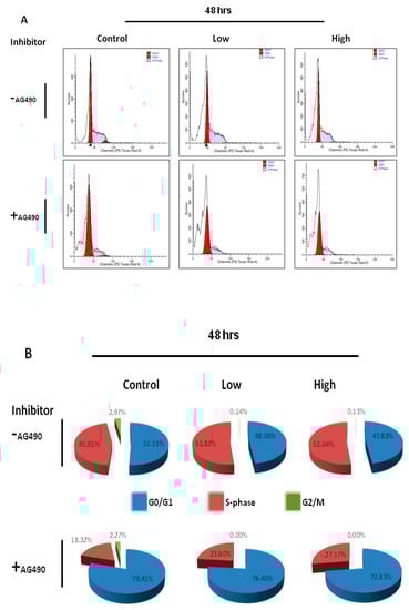 To reveal mechanistic pathways through which IL-6 might affect C2C12 characteristics, the activation of the JAK-STAT pathway in IL-6-treated cells was examined. The activation of JAK-STAT signaling was examined in C2C12 cells via the use of antibodies against p-STAT3. All IL-6 concentrations (high, medium and low IL-6 levels) resulted in early induction of STAT3 phosphorylation, shown 5 min after addition of IL-6 (Figure 5A,B). Only high IL-6 concentration (10 ng/mL) appeared to prolong phosphorylation of STAT3 up to 10 min but no longer between 15 and 30 min (Figure 5A,B). Since treatment of C2C12 cells with low and medium IL-6 concentrations exhibited similar effect on cell cycle and associated proteins, low IL-6 concentration (10 pg/mL) and high IL-6 concentration (10 ng/mL) were chosen for further comparative experiments. To verify that effects of IL-6 are indeed mediated by STAT3 phosphorylation, responses were assessed in the presence of a JAK2-STAT3 inhibitor, AG490. AG490 was added to cultured C2C12 cells in the 48 h experiment with every media change (Figure 5C,D). Similar stocks of C2C12 cells were used for both inhibitor and no inhibitor experiments. Addition of STAT3 inhibitor resulted in reduced STAT3 phosphorylation compared to controls, irrespective of the IL-6 concentration used at the beginning of the 48 h experiment (Figure 5C). Finally, addition of the inhibitor resulted in decreased PCNA, MyoD and myogenin levels in IL-6-treated cells compared to controls at the end of the 48 h experiment (Figure 5D,E). At the end of the 48 h incubation, the JAK2-STAT3 inhibitor, AG490, resulted in more cells being in the G0/G1phase with a consequential decrease in cells in the S-phase for both low and high IL-6 concentrations (Figure 6A,B). The STAT3 inhibitor completely inhibited cell division in both low and high IL-6 concentration-treated experiments (Figure 6A,B).